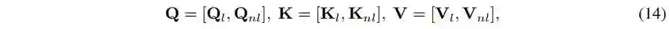 等分后分别输入到两个分枝,local 分枝和 non-local 分枝,其中的 local 分枝计算 self-attention 如下: