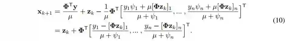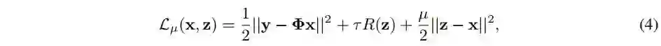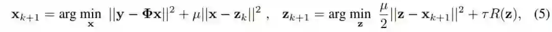 为了得到展开式的推导,同时使迭代过程更加简单,能够更快地收敛,我们对公式(3)采用 Half-Quadratic Splitting (HQS)算法进行展开,得到: