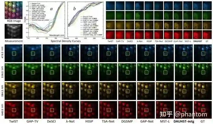 在仿真数据集上的定性结果对比如图5所示。左上角是RGB图像和快照估计图(Measurement)。下方四行图像是不同方法重建的四个波长下的高光谱图像。右上角的图像是下方图像中黄色框框内的放大图。从重建的高光谱图像来看,我们的方法能更好地恢复出细节内容和纹理结构,请注意对比小立方块区域。a 和 b 曲线对应着 RGB 图像的两个绿色框的区域的光谱强度曲线,可以看出,我们的 DAUHST 与 Ground Truth 的曲线最为接近。