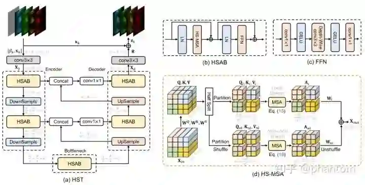 我们半交互式 Transformer (Half-Shuffle Transformer,HST)的整体结构如图3 (a) 所示,采用一个 U 形网络,包含 一个 Encoder,Bottleneck,Decoder。其中基本单元是 Half-Shuffle Attention Block (HSAB)。HSAB中最重要的模块是 Half-Shuffle Multi-head Self-Attention (HS-MSA)。