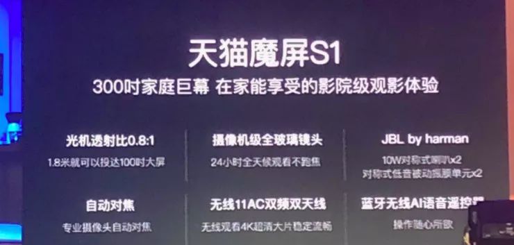 第二款新品是天猫魔屏S1,具备三种特点:“更大”——最大投射屏幕有300寸;“更短”——只需1.8米距离就可以投射出100米的影院效果;“更亮”——达到3000流明。