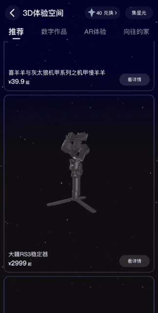 天猫依托底层3D引擎(AceNNR)、AI引擎(MNN)、AR引擎、多媒体等技术,让我们能通过AR应用、3D展示等各种方法,看到各种产品的形态。