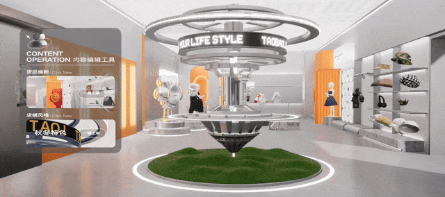 就比如上面这样一个淘宝人生风格的虚拟3D店铺,商家可以选择合适的3D商品在货架上进行展示,也可以根据不同的消费季节一键替换店铺风格。