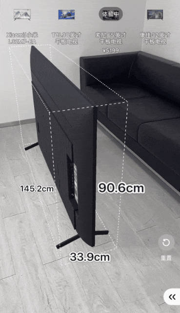 打开手机天猫app,看看这个AR场景,尺寸和效果展示都在,你甚至可以想象坐在沙发上看这个电视的感觉,有点上头是吧?