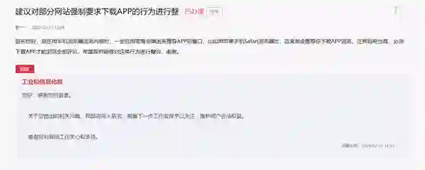 不为别的,该网友反映的问题,戳中大多数人的痛点:“现在用手机浏览器浏览内容时,一些应用常常会弹出推荐APP的窗口……必须下载APP才能浏览全部评论……”