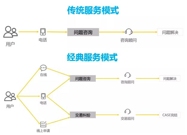 传统的客服模式始于电话客服,会有专业的咨询顾问帮客户解答问题。之后有了在线客服和线上申请,在线客服类似于文字聊天,线上申请是非实时的通讯方式,可以理解为类似留言或者邮件的形式。
