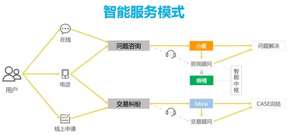 在阿里场景下我们对问题进行了区分,将其分成问题咨询和交易纠纷,分别有专门的顾问进行解答。在智能服务模式下,在问题咨询端建立了小蜜这样的产品,小蜜解决不了的复杂问题会转到人工顾问这一端,为用户提供更全面的服务。即便这样,在人工客服一端,也有对应的智能辅助产品,帮助提高人工客服的服务效率,比如检索是否有历史相似答案提供给人工客服,帮助他们快速完成解答。