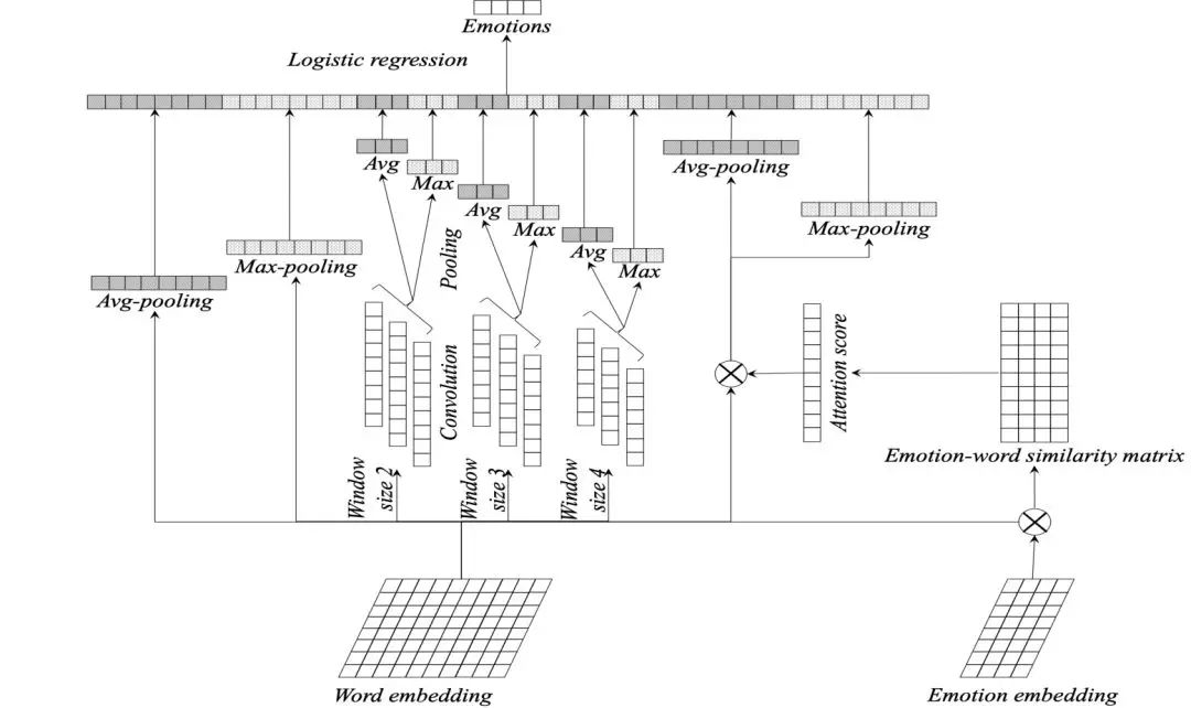 上面是模型图,最左边的两个 poolling 是在做句子级别的语义特征抽取,这个实际上用的是 swem 算法;中间是 n-gram 多元的特征抽取,用的是 cnn 的模型,我们提取了两元、三元、四元这样的信息形成特征;最右侧的一块是 emotion embedding,用到了 18 年发表一篇文章的思路。