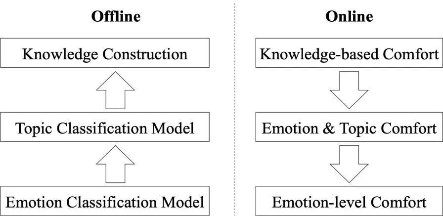在线端,其实是一个相反的过程,首先识别用户所说的是不是和之前总结的知识点比较接近,如果有就拿出来进行回答,如果没有就看是否可以归结到某种主题这样的情况上,如果再没有的话,就监测它是不是仅仅是属于一种情绪表达,然后给出更宽泛的情绪安抚。