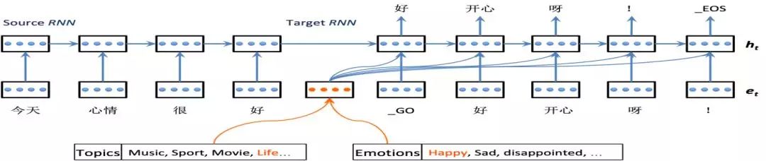 我们的目的是让机器人产生带情绪的回复,另外希望回复更具有针对性一些,而不是全部都是通用的 ’ safe response ',在下面的模型里,除了情绪,我们还可以添加 topic 相关的信息,分析出聊天的主题。下面的例子里,客户说今天心情很好,聊的是生活化的主题,表达的是高兴的情绪,这时候我们生成 ’ 好开心啊 ',回复用户。