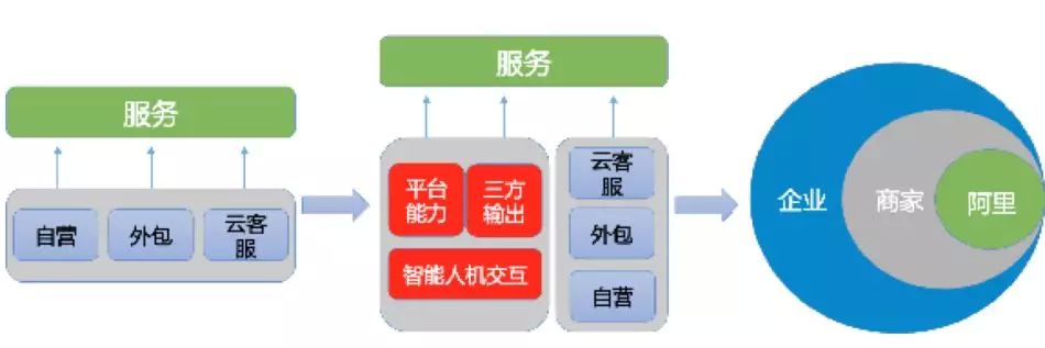 智能客服能力建立之前,人工服务的能力来自于自营客服、外包客服和云客服。模式升级之后,利用智能服务的能力,形成了平台能力、三方能力、智能人机交互这三种服务模式。服务的对象可以理解为三个层次,其中,阿里是包括指淘宝、天猫、咸鱼、淘票票等阿里巴巴内部产品平台的范围;商家是指依托于阿里巴巴淘宝和天猫等平台之上的外部商家;企业则是指纯粹外部的企业。