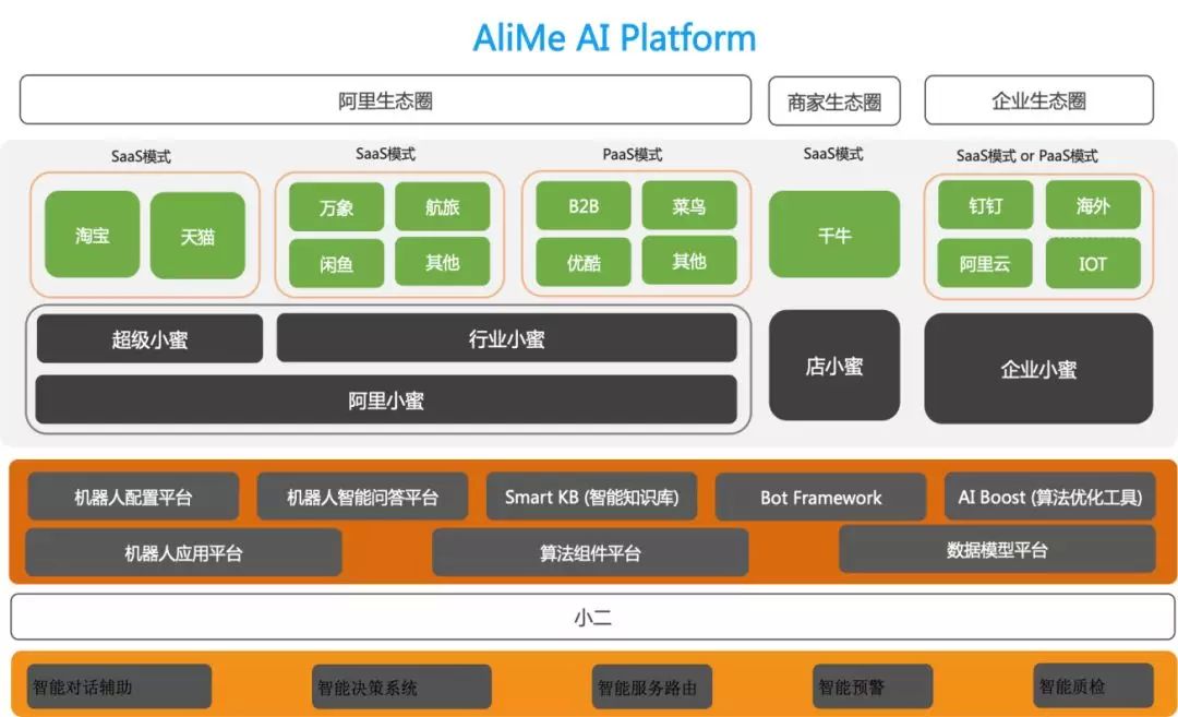 如图,最下面这层其实是为小二进行服务的,小二是阿里客服的简称。在上面机器人配置平台这一层是为机器人服务提供一些能力。再往上一层是按照产品进行划分,分成阿里小蜜、店小蜜和企业小蜜。阿里小蜜主要服务阿里内部的淘宝天猫这样平台,店小蜜服务阿里平台上的商家,企业小蜜服务于外部企业。