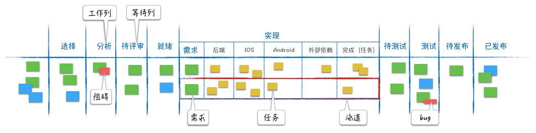 需求在看板上从左至右流动,经过看板上的每个阶段,直至交付。从最左的“选择”列,决定做一个需求开始,直到上线结束。这是一个端到端的过程,拉通了产品、开发、测试、运维等各个前后环节。