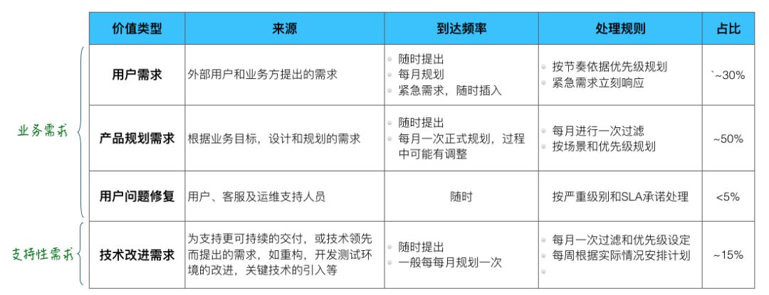 不同的产品和组织,对流动单元的分类不同。上表是某个产品交付团队的需求分类,它区分了需求的类别,其输入的规律及处理的规则等。