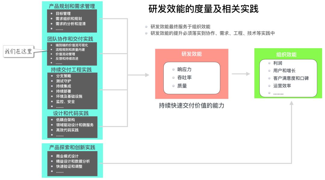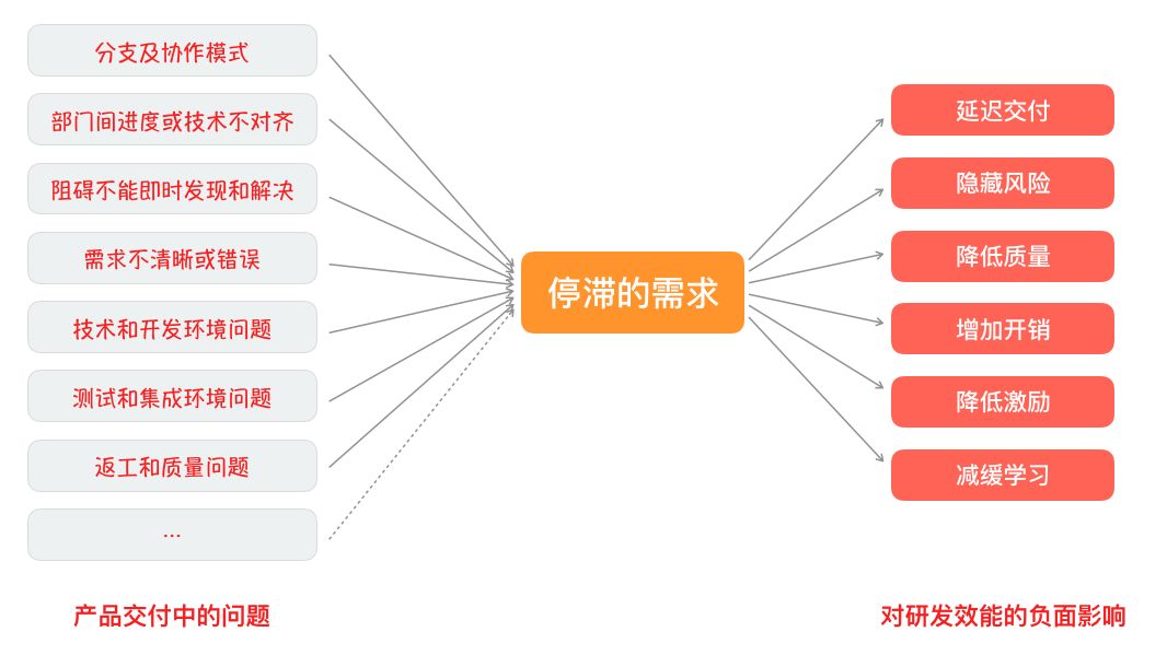如下图所示,产品交付中的各类问题,都会导致需求停滞。比如常见的协作、环境、工程方法、质量等问题,都会表现为需求停滞,停滞的需求又从根本上损害研发效能,图中列出了其中的一些影响。