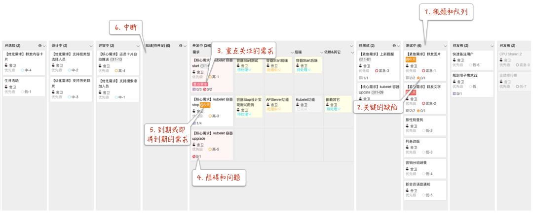首先,它反映了环节间的协作。看板上的各个列,代表需求交付的环节。价值项沿各个列顺序流动,体现上下游之间的协作。它们中有些是工作列,如:分析、实现、测试等,价值项在工作列被处理;有些则是等待列,如待评审、就绪、待测试、待发布等。