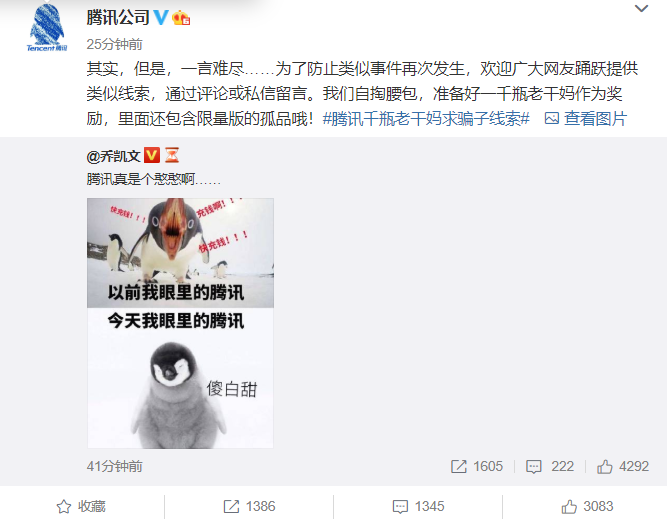 腾讯回应“被骗”:以1000瓶老干妈为礼品征求骗子线索