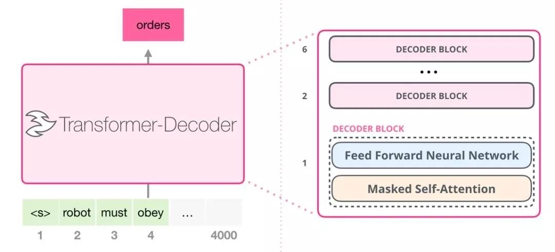 这些解码器模块和 transformer 原始论文中的解码器模块相比,并没有很大的差别,仅仅只是将第二层的自注意力层给去掉,原本的自注意力层中,会把encoder层的输出和上一层的结果进行注意力计算。但是GPT-2使用的是循环结构,每次把新生成的词添加到原有的序列后面,然后再重新参与计算。通过这种方式,将encoder给去掉了。这样OpenAI 的 GPT-2 模型就用了这种只包含编码器(decoder-only)的模块。