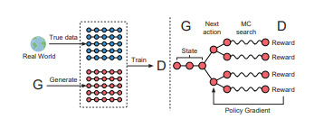 对于前者,给出的解决方案相对比较熟悉,即把整个GAN看作一个强化学习系统,用Policy Gradient算法更新Generator的参数;对于后者,则借鉴了蒙特卡洛树搜索(Monte Carlo tree search,MCTS)的思想,对任意时刻的非完整序列都可以进行评估。