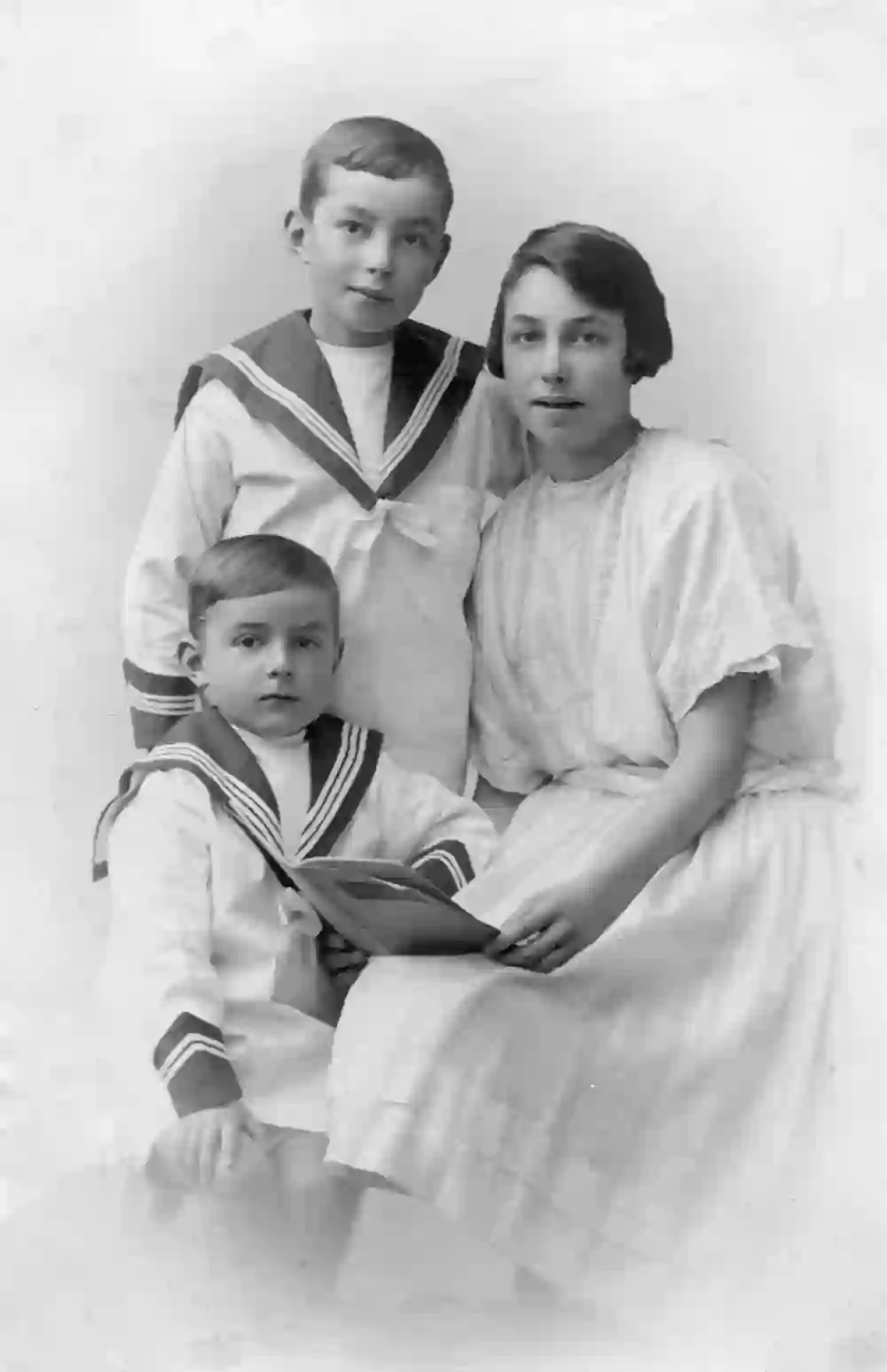 乔伊丝比我大十岁。她的母亲,我父亲的首任妻子,在一次流感爆发中去世。乔伊丝总是能够想出一些令人激动的游戏,而我们经常玩牛仔和印第安人游戏。乔伊丝需要在家中承担大量责任,但她对此没有怨言。除了照看两个弟弟,她还是我父亲在家里的主要帮手。我的父亲动手能力很强,而这是件幸事,毕竟我们钱财拮据。他能够搞定大多数人需要雇人来做的事情:修缮屋顶、修理煤气、更换墙纸,等等。但时不时地,他和乔伊丝会爆发争执,而乔伊丝会生气地跑下楼,甩下一句,“我再也不会帮他了”。过了大约十分钟,我的父亲会下楼道歉。然后他们会和好,并相安无事一段时间(图1.3)。