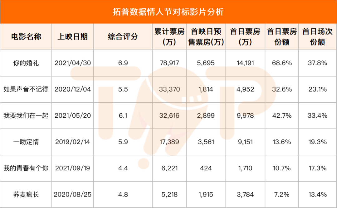 而纵观历届情人节档(除了2020年情人节),据猫眼专业版数据显示,2017年到2019年,当日票房分别为3.92亿元、2.63亿元、6.72亿元,而票房日冠分别是《极限特工:终极回归》《西游记女儿国》和《流浪地球》;2021情人节档恰好与春节档重叠,虽没有新片上映,但单日票房达到了峰值14.72亿元。由此可见,大部分情人节档,扛起票房大盘的,依然是春节档影片。