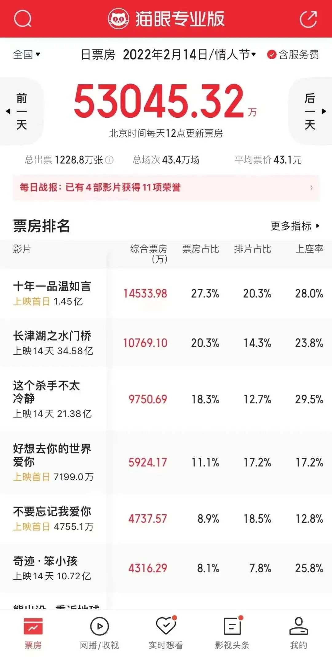 根据猫眼专业版,2月14日,全国总票房破5.3亿元,《十年一品温如言》排片占比达到20.3%,票房占比27.3%,截至15时31分,票房即已破亿,领跑情人节档,力压已经上映14天、拿下单日票房冠军13天的《长津湖之水门桥》,成为新的单日票房冠军。