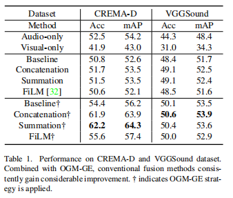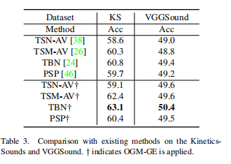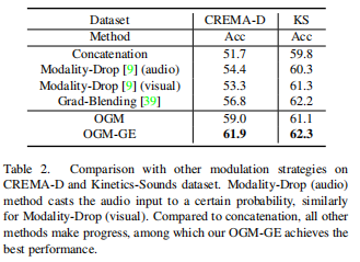 在表3中,可以发现OGM-GE加强了这两种方法。此外,如前所述,OGM-GE并不局限于音频和视觉编码器在融合过程之前没有交互作用的模型配置。