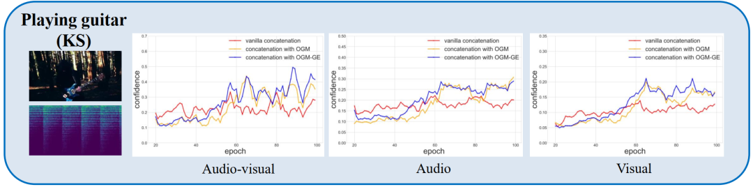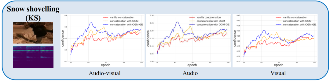 如上图所示,对于大多数样本来说,“弹吉他”是一个音频超过视觉模态的类别(“铲秀”正好相反),我们可以说音频实现了更充分的训练,并引领了优化过程。我们的OGM-GE(以及OGM)在多模态和多模态性能方面都获得了改进,并且弱视觉获得了更好的效果。“音频”和“视觉”中使用的评估指标是仅来自一个特定模态的分类分数的预测准确度。