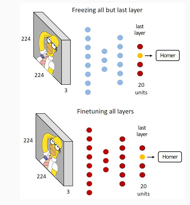 在下图中,我们可以看到上述提到的两种迁移学习策略。我们在 ImageNet 上使用了一个预训练的 CNN,并将 Simpsons 数据集的子集 Homer Simpson 作为目标集,用该网络对其进行分类。这个子集包含 20 个类,每个类有 300-1000 个图像。