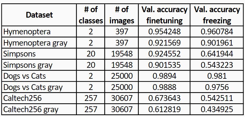 我们观察到的第一个细节是,相比色度数据集而言,训练灰度数据集准确率会下降。这与其他文章作者观察一致,即基础数据集和目标数据集之间的域差异越大,迁移效果越差。