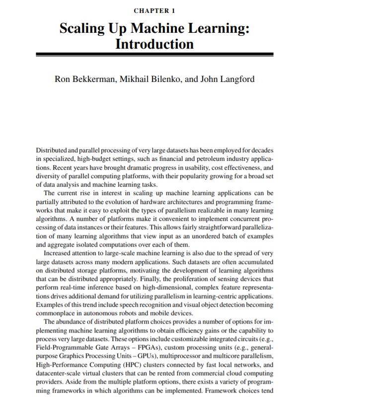 本书介绍了在并行和分布式计算平台上扩展机器学习和数据挖掘方法的代表性方法的集成集合。对并行学习算法的需求是高度特定于任务的:在某些情况下,并行学习算法是由庞大的数据集驱动的,而在另一些情况下,并行学习算法是由模型复杂性或实时性能需求驱动的。为大规模机器学习选择适合于任务的算法和平台,需要了解可用选项的好处、权衡和约束。本书提供的解决方案涵盖了一系列的并行化平台,从FPGAs和gpu到多核系统和商品集群,并发编程框架包括CUDA、MPI、MapReduce和DryadLINQ,以及学习设置(监督、非监督、半监督和在线学习)。广泛的并行化的推进树,支持向量机,谱聚类,信念传播和其他流行的学习算法,并深入到几个应用,这本书适合用的研究人员,学生,和从业者。