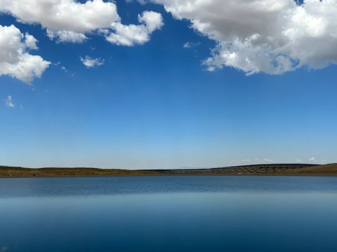 距离光伏电站几公里远的地方,有一片被称为“月亮湖”的湛蓝湖水,为植物生长提供了水源。达拉特旗光辉水务投资有限公司参与了这项工程的建设,水源来自高头窑煤矿的疏干水,在采用超滤、反渗透等处理工艺之后,净化成为光伏基地的产业用水。