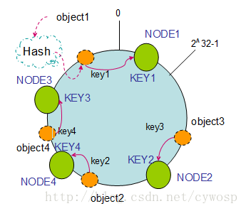 通过上图可以看出对象与机器处于同一哈希空间中,这样按顺时针转动object1存储到了NODE1中,object3存储到了NODE2中,object2、object4存储到了NODE3中。在这样的部署环境中,hash环是不会变更的,因此,通过算出对象的hash值就能快速的定位到对应的机器中,这样就能找到对象真正的存储位置了。