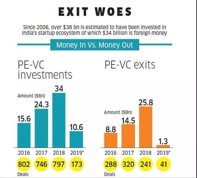 而当时的宏观背景是:自 2006 年以来,约有 380 亿美元资金投资于印度的创业生态系统,其中 340 亿美元是外国资金。即使回报率是 2 倍,这也意味着至少应有 760 亿美元的投资回报金额,但整个风投生态系统甚至连 380 亿美元的投资本金都无法返还。