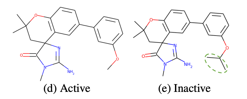 传统的图对比学习中,与驻留在连续域中的图像相比,图本质上是离散的数据结构,因此即使有轻微的扰动,它们的属性也可能会完全不同。例如,图(d)和(e)中的两个分子表明,尽管它们具有高度相关的结构,但他们的分子作用完全不同。