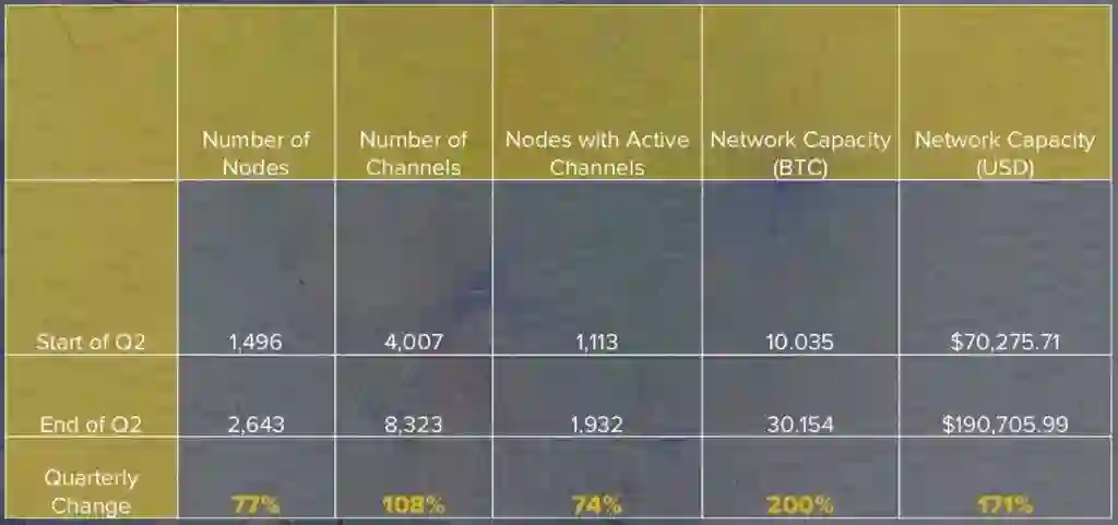 实际上,支付渠道的使用 – 两方之间的小型、频繁交易是在链外进行的,区块链保留用于最终结算在第二季度蓬勃发展,因为闪电网络将其解决方案推向某些扩展问题。