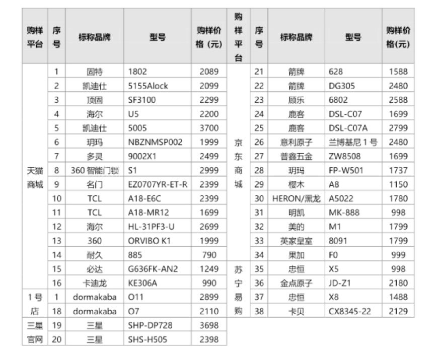 此次检测的样品主要从京东商城、天猫商城、苏宁易购、1号店、三星官网等电商平台随机购买,涉及品牌包括海尔、三星、美的、TCL、360智能门锁等,价格从790元到3700元不等。换句话说,本次检测样品范围几乎涵盖普通人购买智能门锁的所有主要渠道和可选品牌。