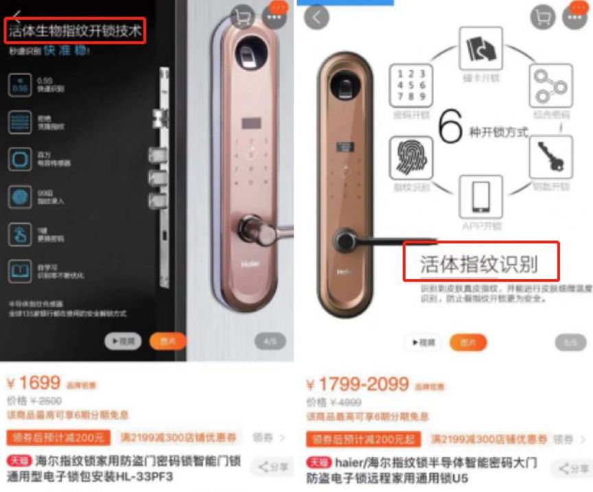 值得一提的是,那些虚假宣传自己具有“活体指纹检测”功能的产品,其中不乏是由鹿客、凯迪仕、TCL等“大牌”厂商制造的。