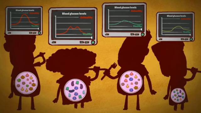 为了理解不同个体之间为何存在如此巨大的差异,研究者采集每个被试的粪便样本并进行了微生物分析。越来越多的证据表明,肥胖、葡萄糖不耐受以及糖尿病都与肠道细菌相关,而这项研究显示,特定的微生物与餐后的血糖上升情况相关。
