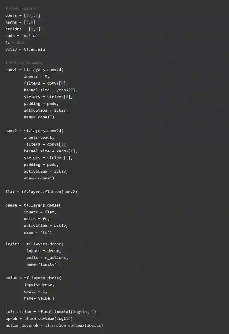 我们会使用 convnet ,和之前使用的著名 DQN 算法是类似的,我们的神经网络会输入一个压缩大小为 84X84 像素的图像,输出一个 16 卷积 4 跨度的 8X8 内核,跟随 32 个卷积 4 跨度的 8X8 内核,以一个完全连接的 256 层级的神经元结束。对于卷积层,我们会使用 VALID 填充,会极大缩小图像的大小。