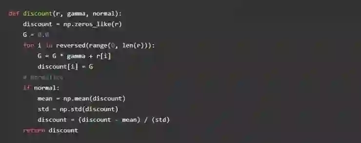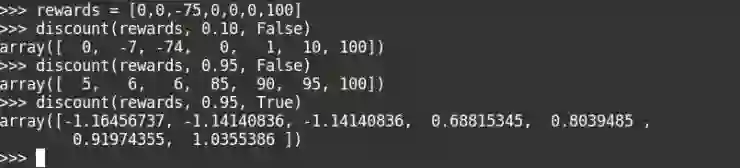 Alpha 是我们的学习率, gamma 是奖励折扣率。奖励折扣是在给定智能体奖励历史的情况下评估未来可能的奖励的一种方法。如果奖励折扣率趋向于 0,那么 Agent 只需要关注当前的奖励而不需要去考虑未来的奖励。我们可以写一个简单的函数来评估某个行为下的一系列奖励,下面是代码: