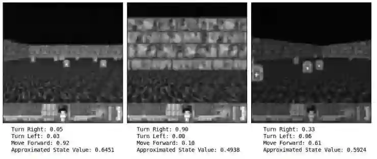 为了更好的测试 Agent 的置信度,在给定任意帧图像你需要将状态输入到神经网络中并观察输出。这里,当遇到墙的时候,Agent 有 90% 的置信度这个需要采取向右是最好的动作,当接下来的图像在右边时候,Agent 有 61% 的置信度得到向前是最好的动作。