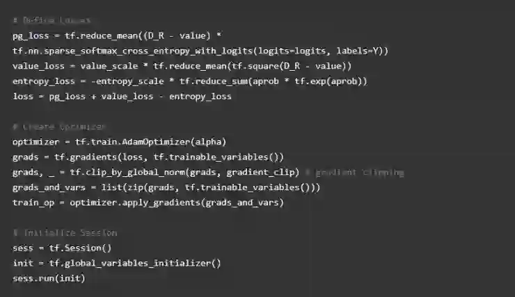 然后,我们将交叉熵损失乘以贴现奖励与我们的价值近似值的差值。 我们使用常见的平均误差损失来计算我们的价值损失。然后我们把损失加在一起来计算我们的总损失。