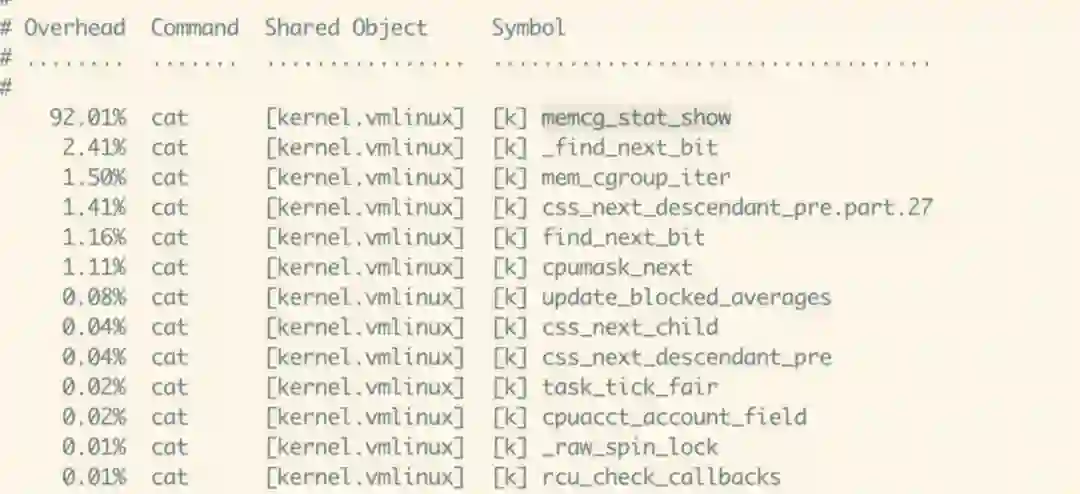在节点 perf record cat /sys/fs/cgroup/memory/memory.stat 和 perf report 会发现,CPU 主要消耗在 memcg_stat_show 上: