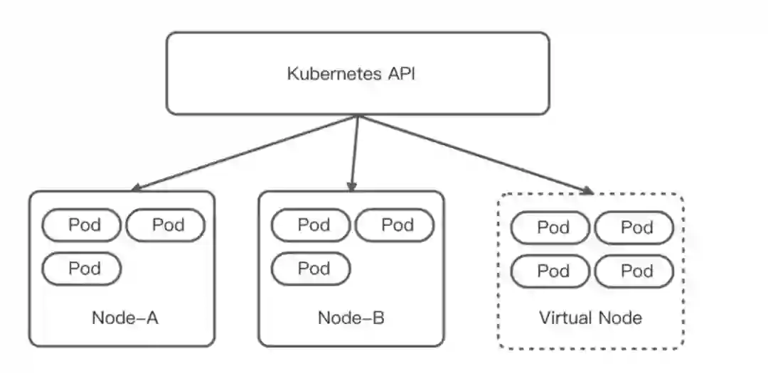 为了解决上述问题,我们考虑将定时任务 pod 和普通在线服务的 pod 隔离开,但是由于很多定时任务需要和集群内服务互通,最终确定了一种将定时任务 pod 在集群内隔离开来的解决办法 —— K8s serverless。我们引入了虚拟节点,来实现在现有 K8s 体系下使用 K8s serverless。部署在虚拟节点上的 pod 具备与部署在集群既有节点 pod 一致的安全隔离性、网络连通性,又具有无需预留资源,按量计费的特性。如图所示: