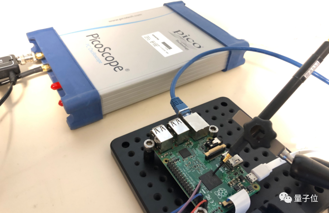 这个数据收集装置分为被攻击设备和示波器两部分,其中树莓派是被攻击设备,高速数字转换器PicoScope 6407(示波器)用于采集和传输数据。