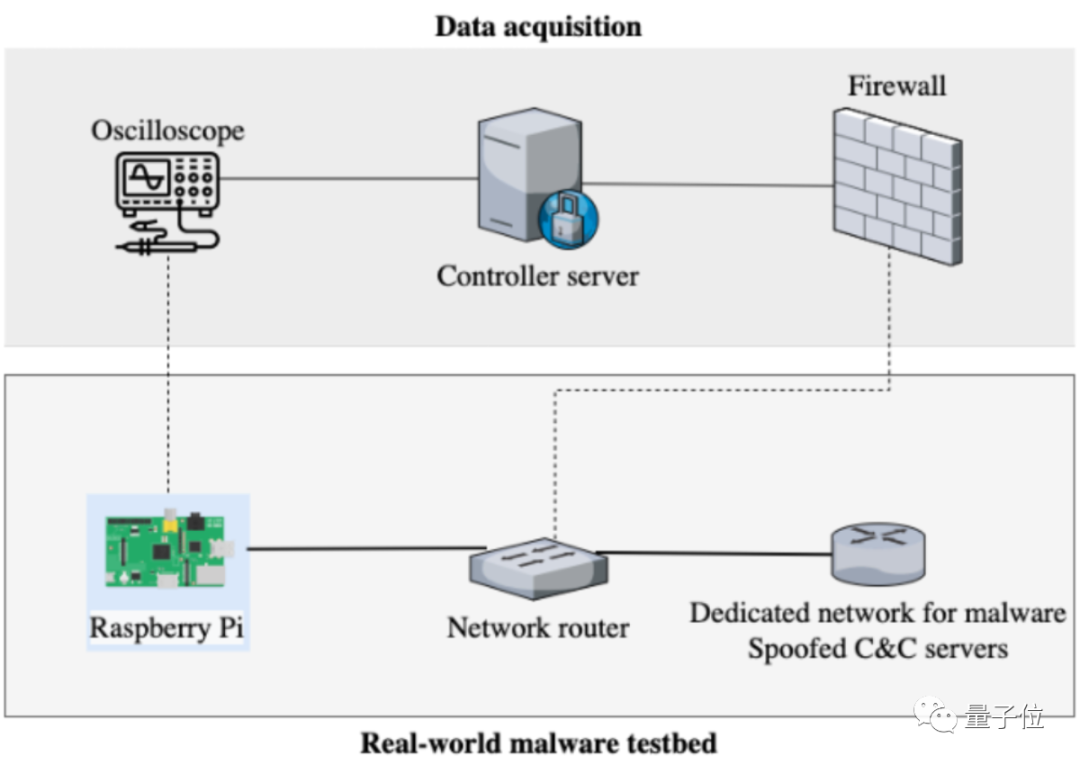 其中,树莓派代表的是“被攻击设备”,示波器用探针在外部收集电磁信号后,传给AI进行预测,AI再将预测结果反馈给防火墙,决定是否要拦截恶意软件。