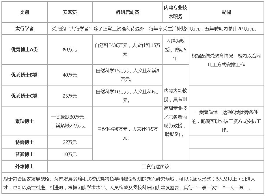 注:各类人才,均须完成规定的考核任务。若入校5年内超额完成任务,达到哪一级可申请该级别优秀博士的安家费。在周转房分配之前,学校每月发放住房补贴800元,补贴时间最长为3年;紧缺博士达到B类优秀博士条件的,可在紧缺博士安家费基础上增加5万元;达到C类优秀条件的,可在紧缺博士安家费基础上增加3万元。紧缺博士也可申请该类优秀博士待遇,但需完成相应考核任务;受聘人特别优秀能够同时完成博士考核任务和校特聘教授聘期任务者,经学校研究批准,可聘为校特聘教授,聘期内,除享受相应职称的工资福利外,每年发放生活补贴一级岗8万元,二级岗6万元,校特聘教授聘期任务除按照“校发字[2013]176号”文件执行外,特聘教授一级岗还须以第一作者发表SCI一、二区收录论文3篇,特聘教授二级岗还须以第一作者发表SCI一、二区收录论文2篇。