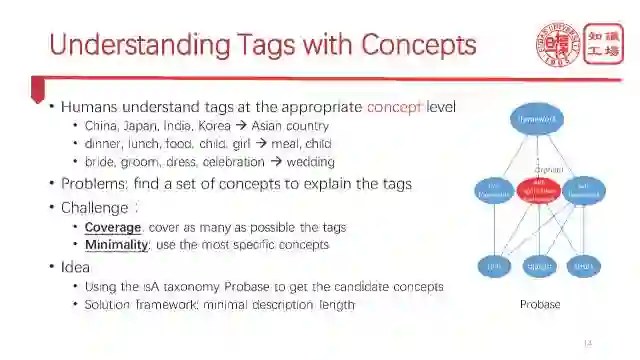 人类是在合适的概念层次来理解标签的。比如说人类看这么一组标签“China,Japan,India,Korea”,很快就会理解,讲的是Asian country。基于概念级别去理解这些标签对于后面做精准推荐是十分重要的。那现在问题来了,我们怎么让机器去理解这些标签?怎么为标签产生一个合适的概念呢?