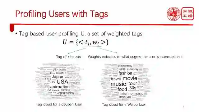 那么在各种各样的画像当中,最流行的一种方法是基于标签的。在很多实际应用中,大家都在广泛的应用这一类基于标签的画像方法。基于画像的标签方法其实很简单,就是给用户打一组标签,每个标签给一个权重,权重代表了用户在这个方面兴趣的强烈程度,如图我们给出了一个豆瓣用户的标签云,也给出了一个微博用户的标签云。不同平台的语言风格,语言体系是不完全一样的,豆瓣的语言倾向于书面化,而微博的语言倾向于碎片化,口语化。